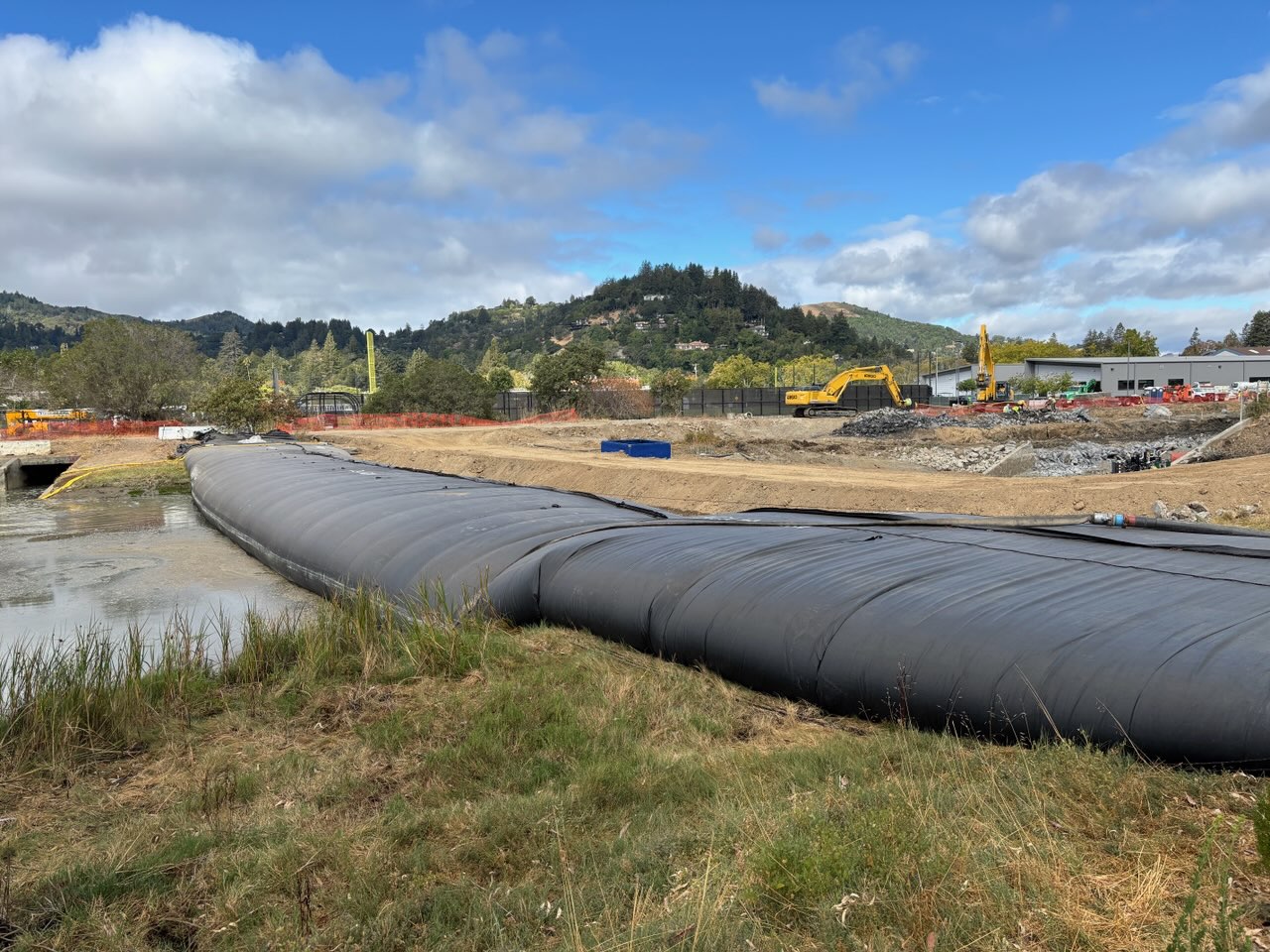 To keep tidal water out of the work area, a cofferdam was installed on September 1. It was essentially a large water balloon which gradually unrolled across the creek as it was pumped full of creek water. A temporary road installed upstream of the dam was used by heavy equipment travelling into the work site on the left bank so that the use of the multi-use path would not be disrupted. Water that leaked into the work area was pumped over the dam and into the creek. The dam was removed on October 13, two days before the mandated date.